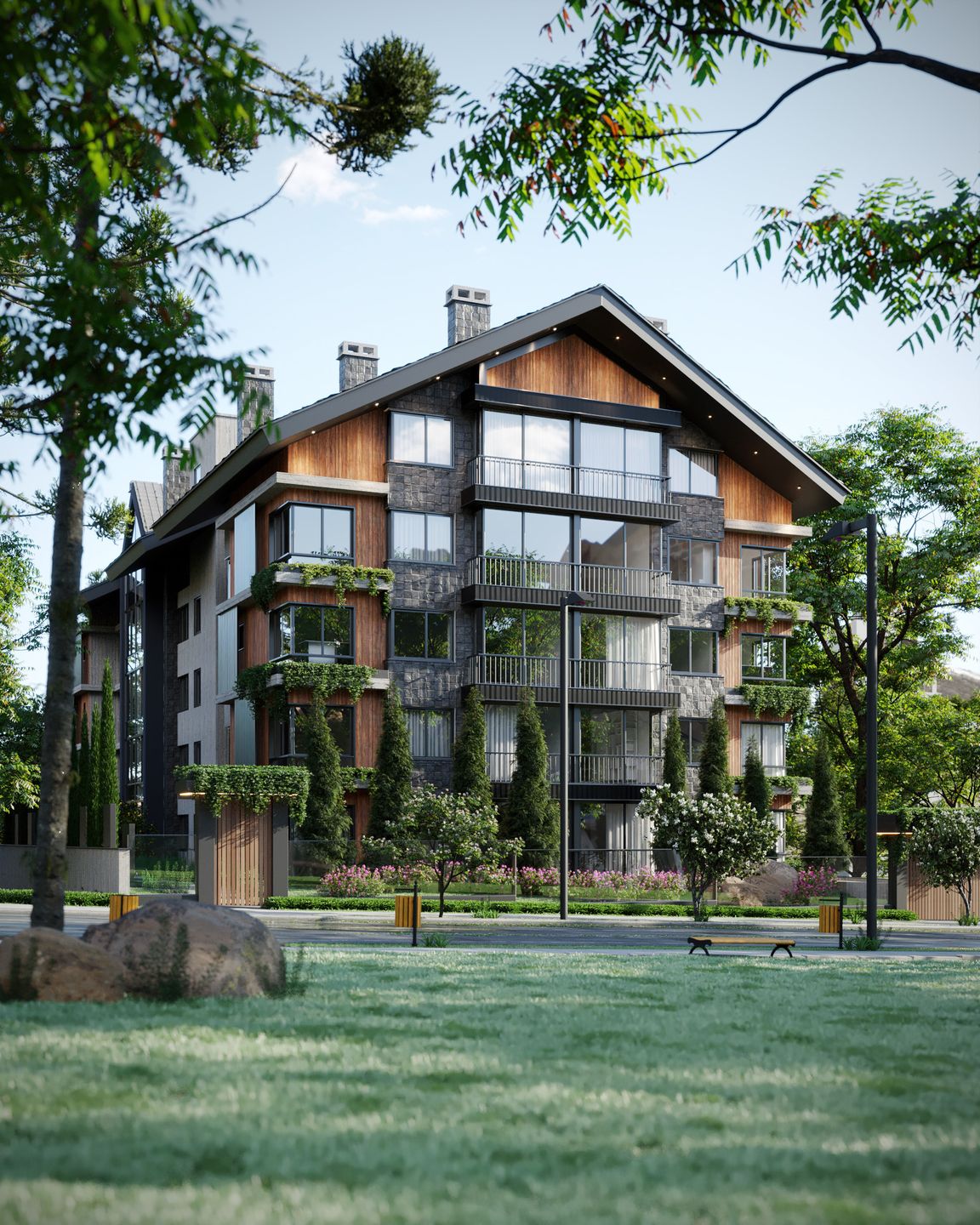 O edifício, exclusivamente residencial, é cercado pelo verde em um projeto paisagístico de excelência. Os caminhos são permeados de flores, plantas, pedras e fontes. Espaços de convivência social, espaços para curtir momentos só seus academia, piscina, sala de jogos, espaço gourmet, espaço kids, lavanderia coletiva. Tudo para incentivar uma rotina prática e saudável