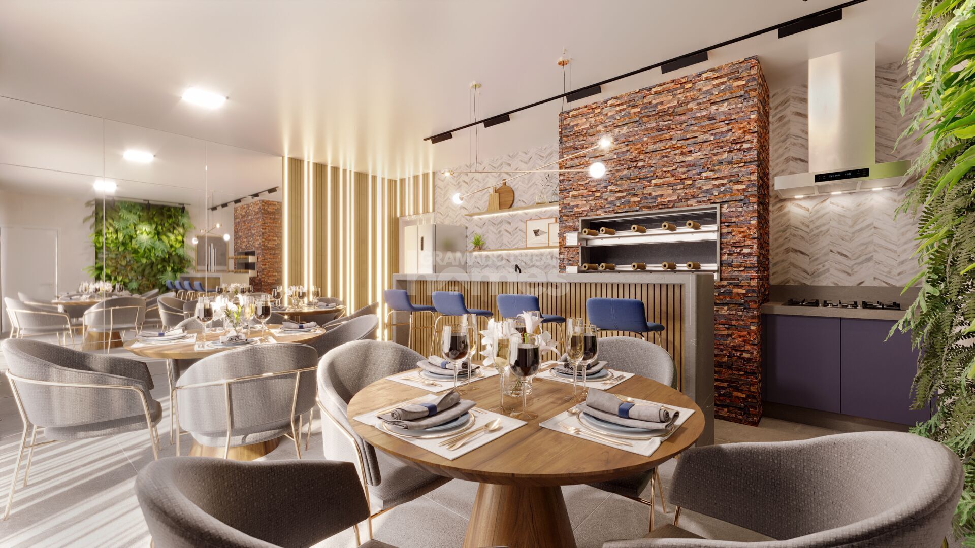 Salão gourmet entregue mobiliado e equipado, com capacidade para 30 pessoas, pergolados externos e aproveitamento de água da chuva para o jardim.