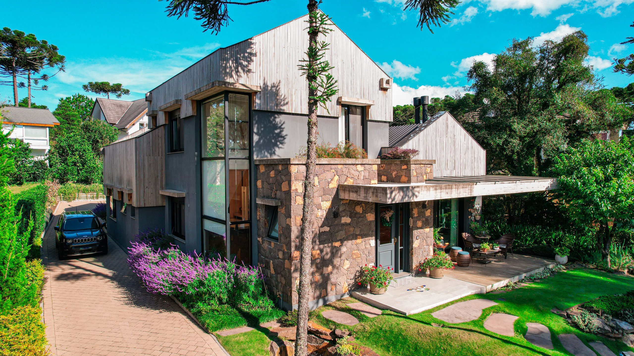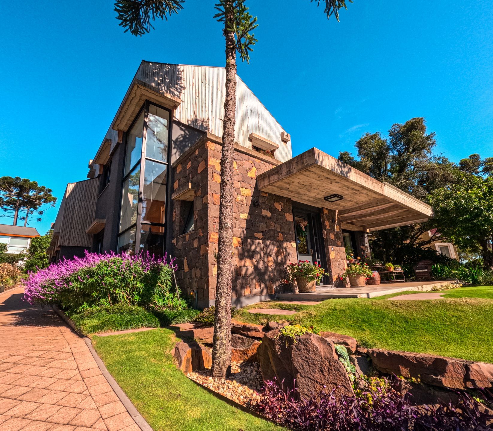 Andar térreo composto por living com lareira integrado a sala de jantar, cozinha, churrasqueira, deck amplo com vista, lavabo, duas suítes térreas e elevador.